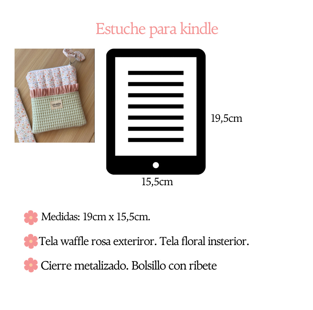 -kindle sleeve waffle menta y Flores pastel + ribete rosa 15,5cm x 19,5cm
