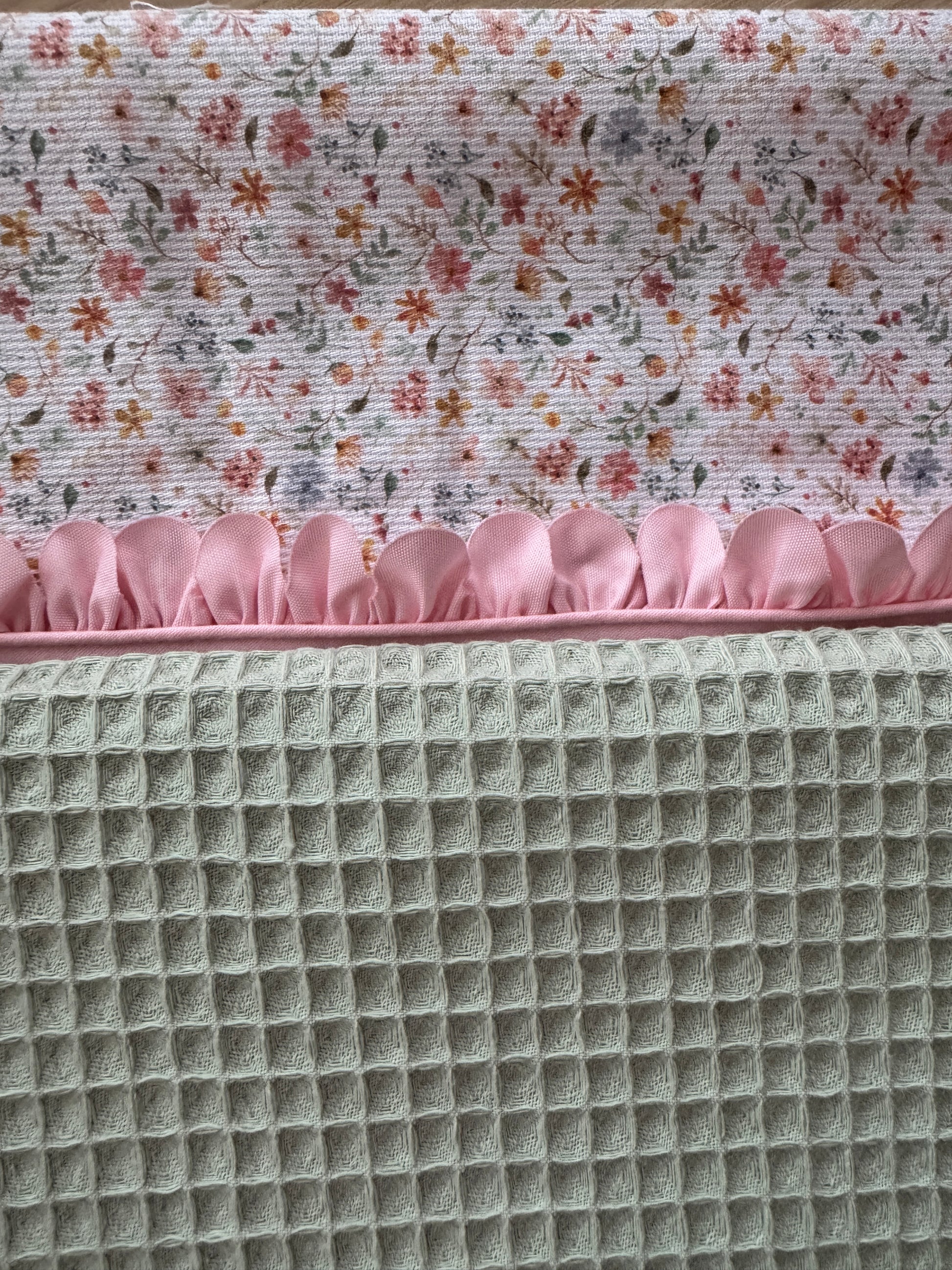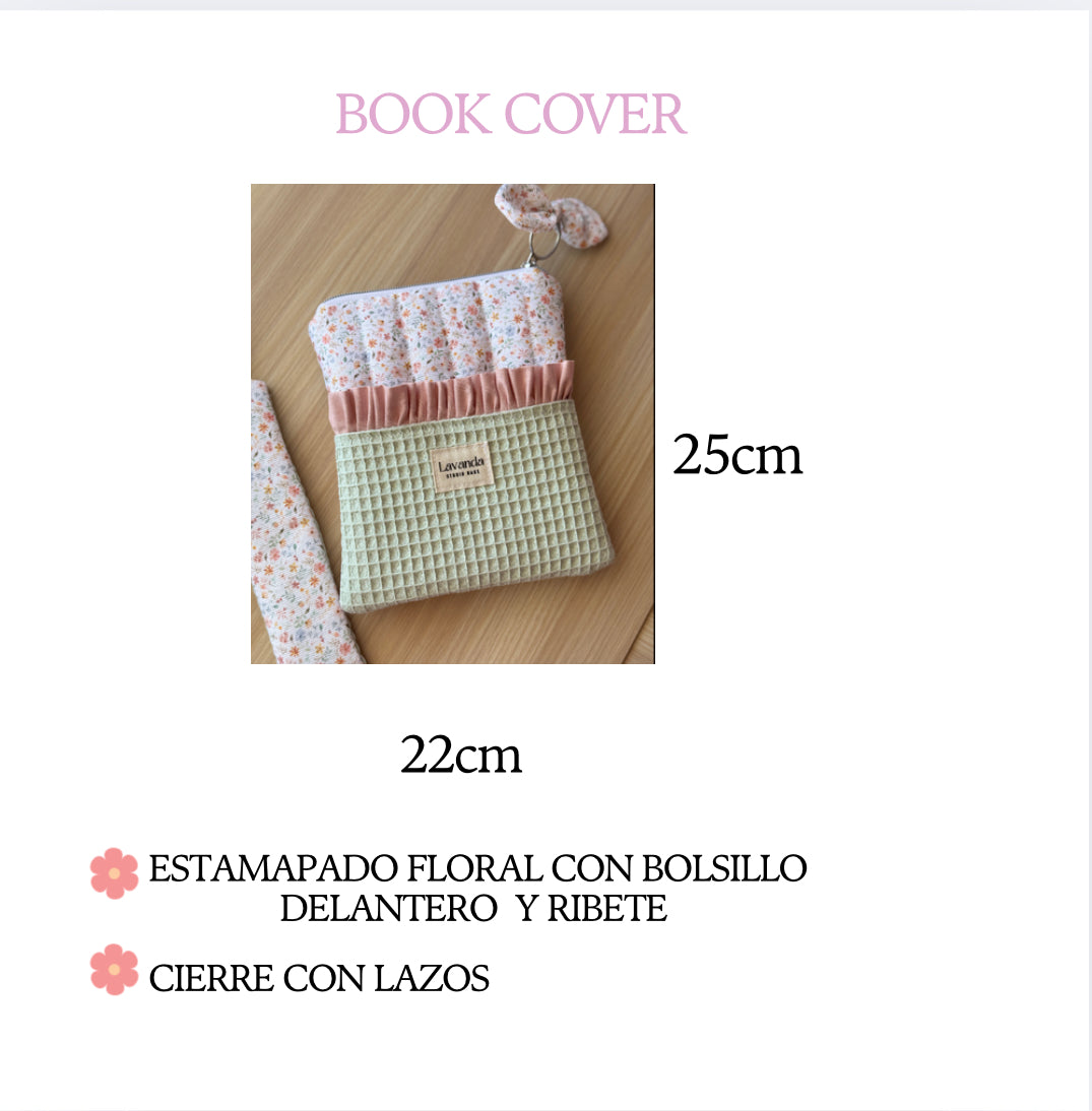 -Book cover waffle menta tela exterior con lazo y estampado floral pastel, +ribete. Medidas 22cm x 25cm