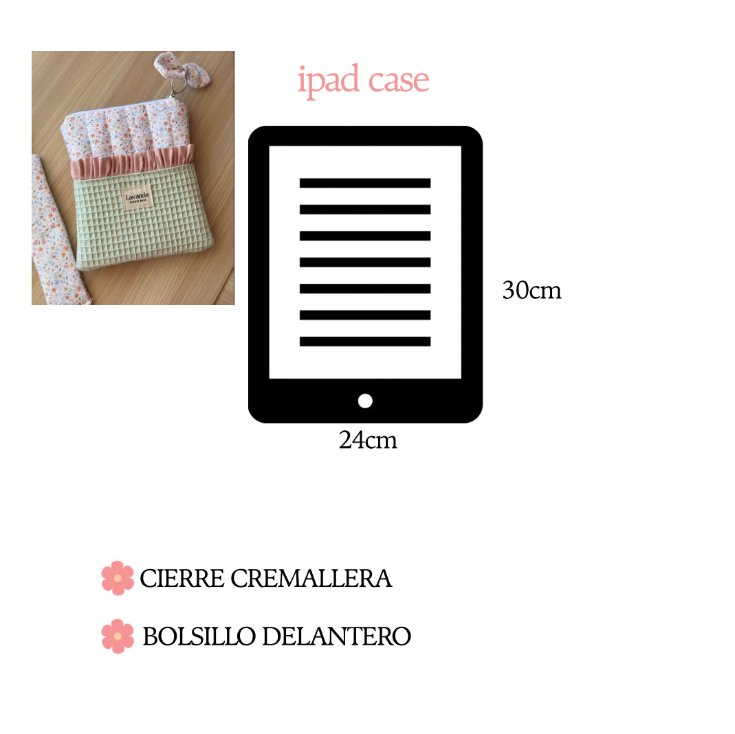 -Estuche iPad waffle menta , flores pastel y ribete rosa .Medidas 30cm x 24cm.