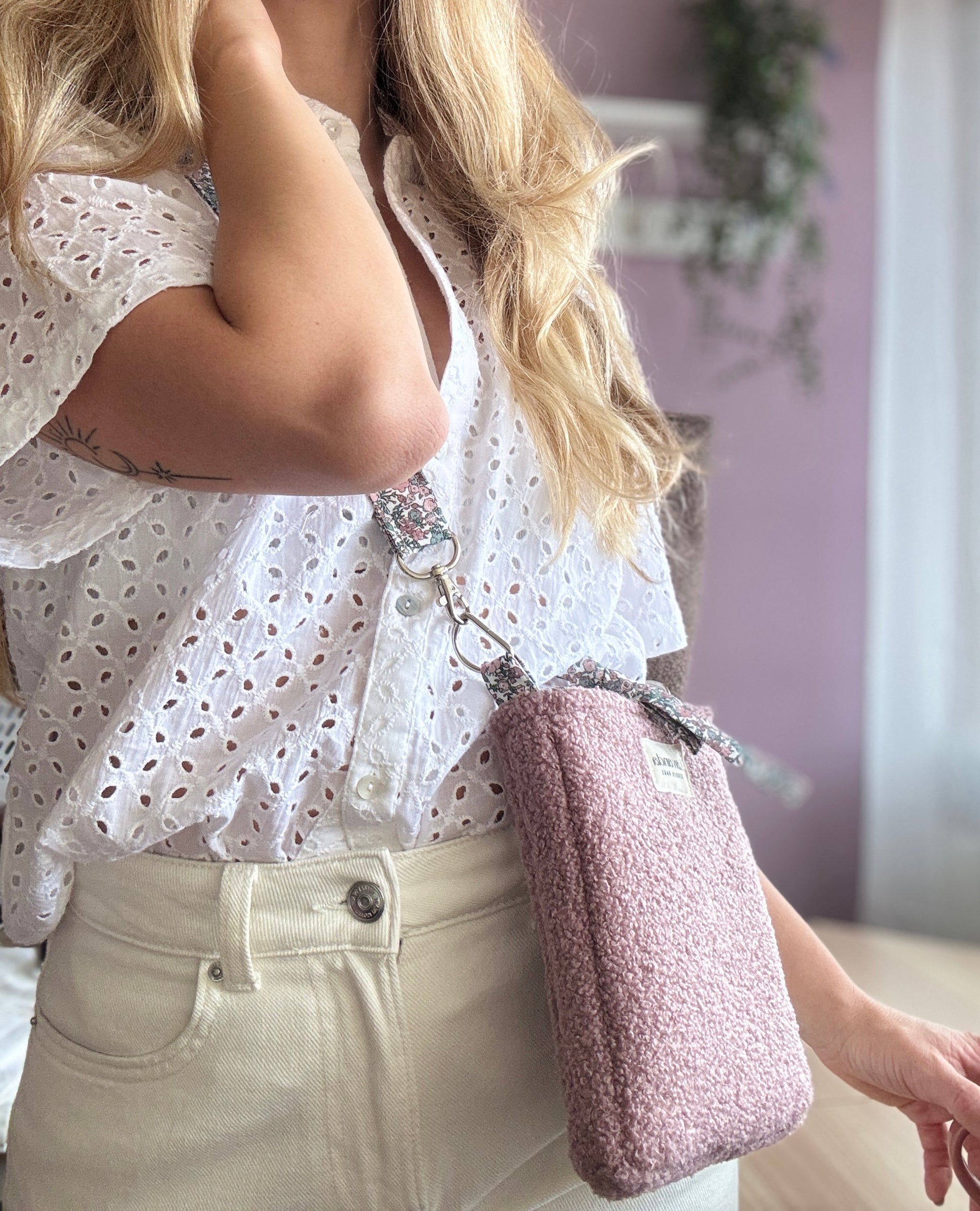 Made from plush teddy-style fabric that feels like a warm hug, it’s perfect for keeping your phone and small essentials close while on the go.